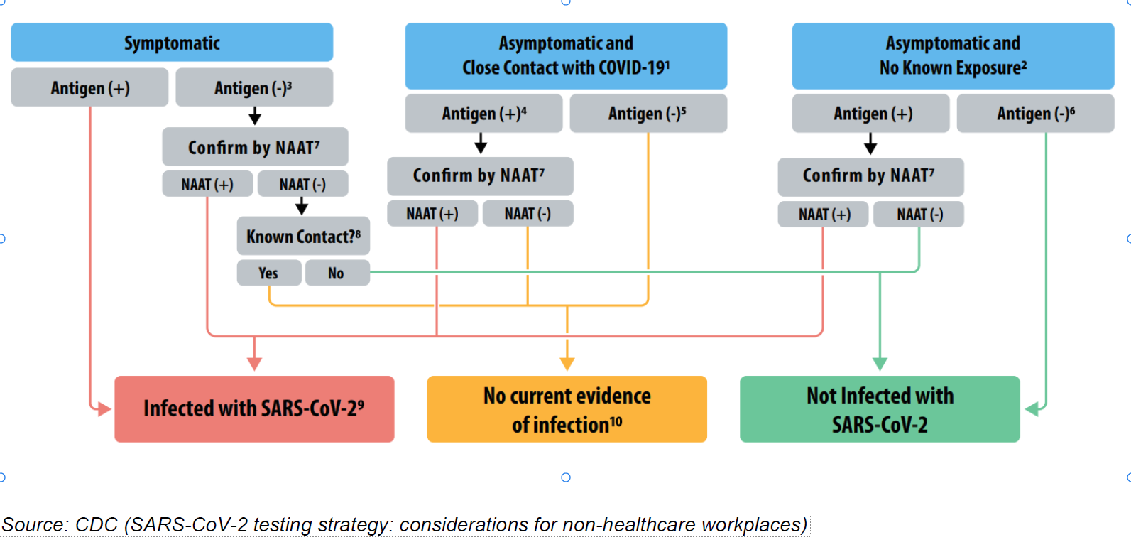 - Screening test: Screening helps identify unexpected infections in asymptomatic people who do not suspect or report exposure to SARS-CoV-2 and thus prevent further transmission. Whenever implemented, serial testing is a component of the comprehensive program and not a substitute for other measures, such as COVID-19 vaccination, social distancing, mask-wearing, hand hygiene, cleaning and disinfection, and adequate ventilation.